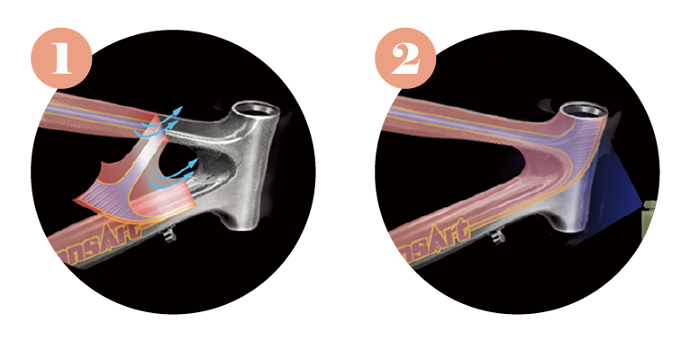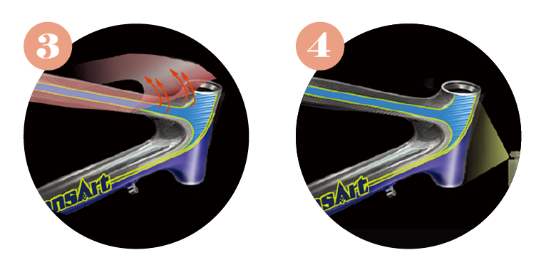 1. 車架先噴妥第一色面漆,烘烤乾燥完全。 2. 去除貼標之離形底紙,選好貼標位置,由上往下,再貼往兩邊。 3. 噴上第二次面漆,截色膜蓋住欲截色部分。 4. 送入烤箱以低於100°C溫度烘烤20分鐘。 5. 待冷卻後撕掉截色膜即完成截色。